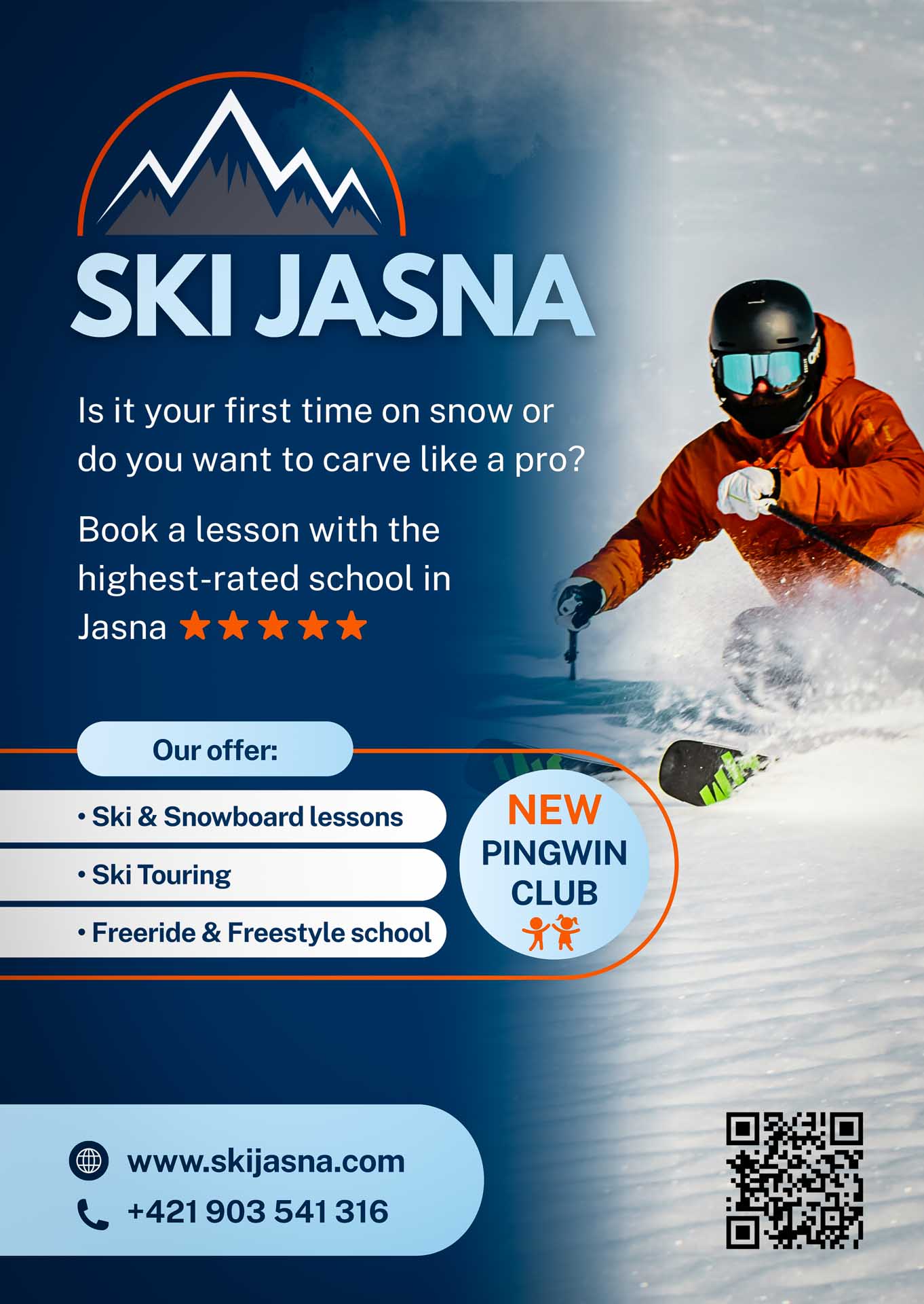 We share the same values with the Ski Jasna ski school: trust, quality and genuine joy of being outdoors. We are convinced that your winter holiday with us will be even richer with new skills, beautiful experiences and memories that will last long after the last snow melts. This has been confirmed by several guests, so we highly recommend: SKI JASNA