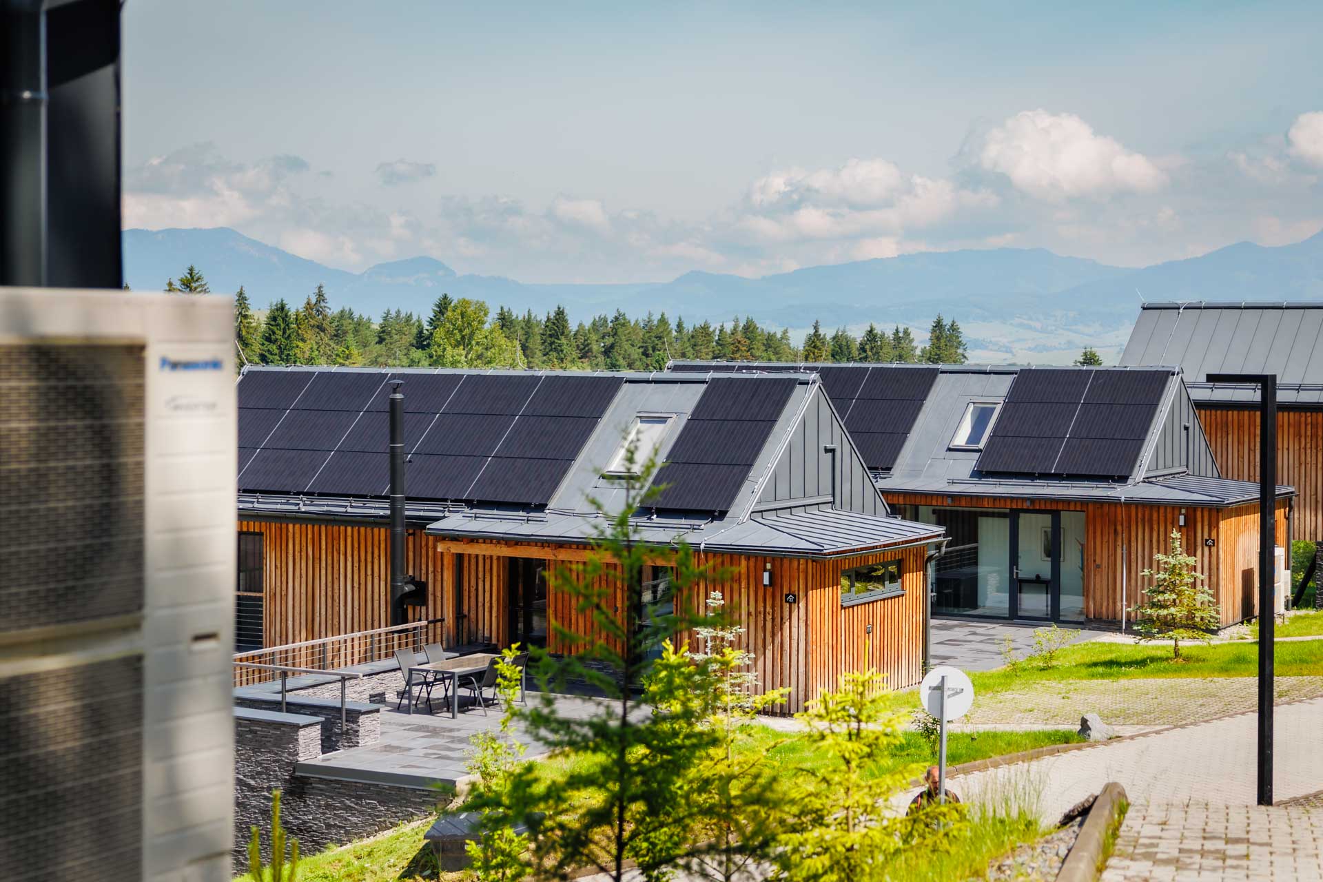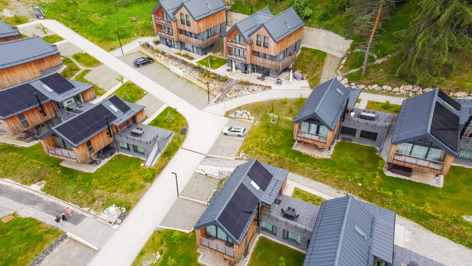 Four photovoltaic power plants cover a significant portion of the resort's consumption. We selected and installed the panels to blend in with the look of the chalets — not every photovoltaic panel looks the same.